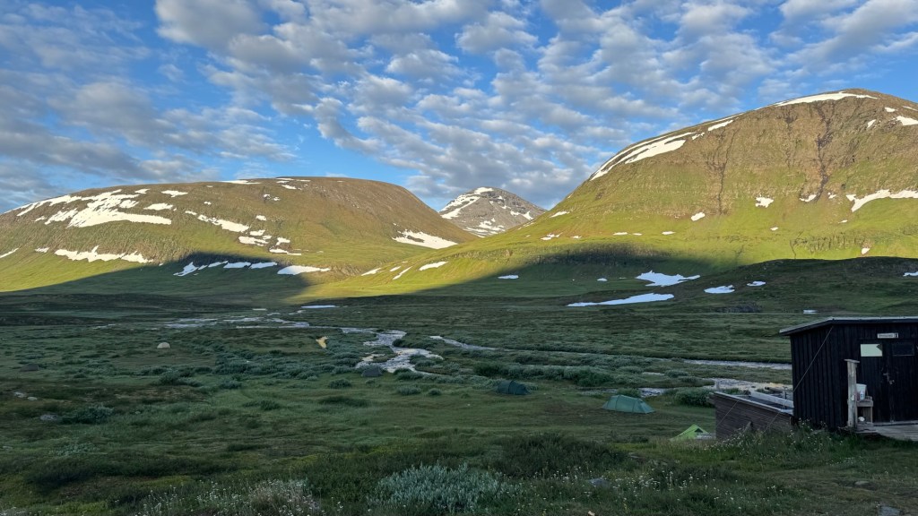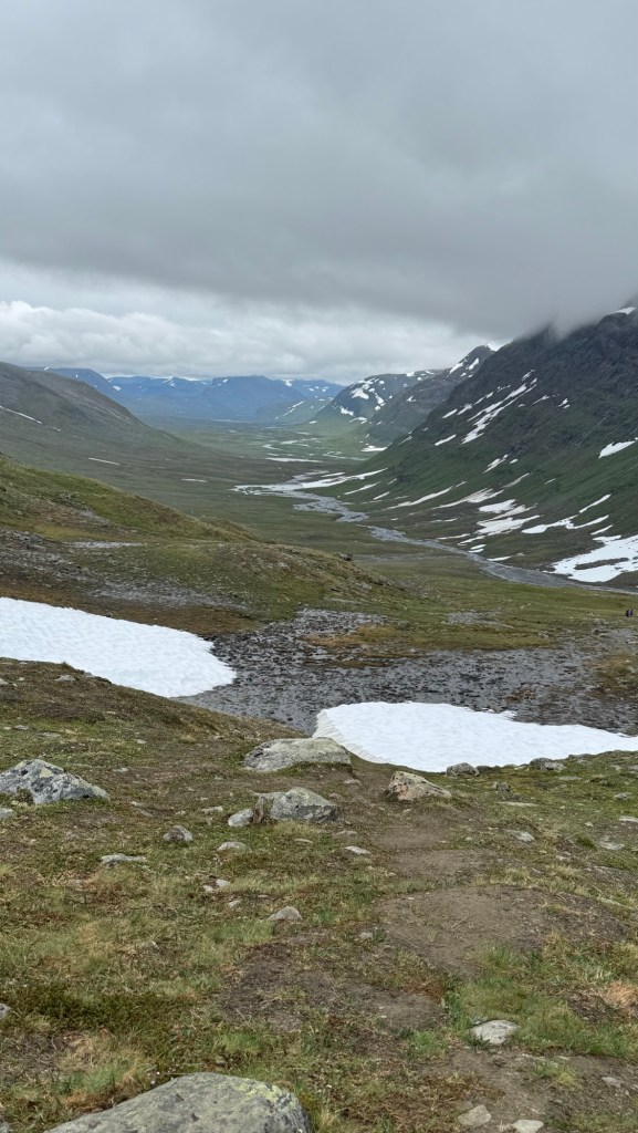 The first couple of kilometers it felt just nice, a hike like nearly any other in a more wooded area. But the further I came the more breathtaking were the views. What I am going to say might sound contradictory but it is the simplicity of the Fjäll, that really struck me. The mountains between the hikers find themselves, are looking like dormant giants, taking a well deserved rest while the snow that hasn’t melted paints pictures on their backs. An upside down ghost here, a bird there, a hand raised for a greeting. All while the masses of melted water are running and falling down to the streams and the lakes, creating the most wonderful pastell torquise. No filter needed, neither for the water nor for the camera.